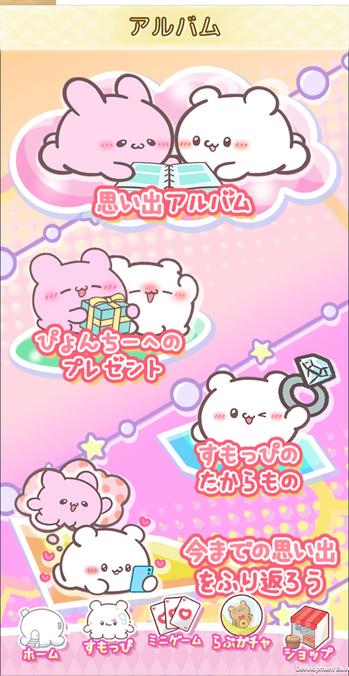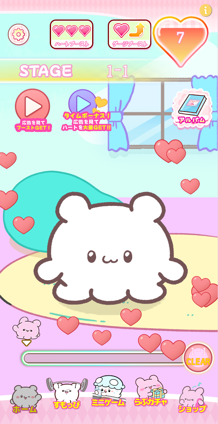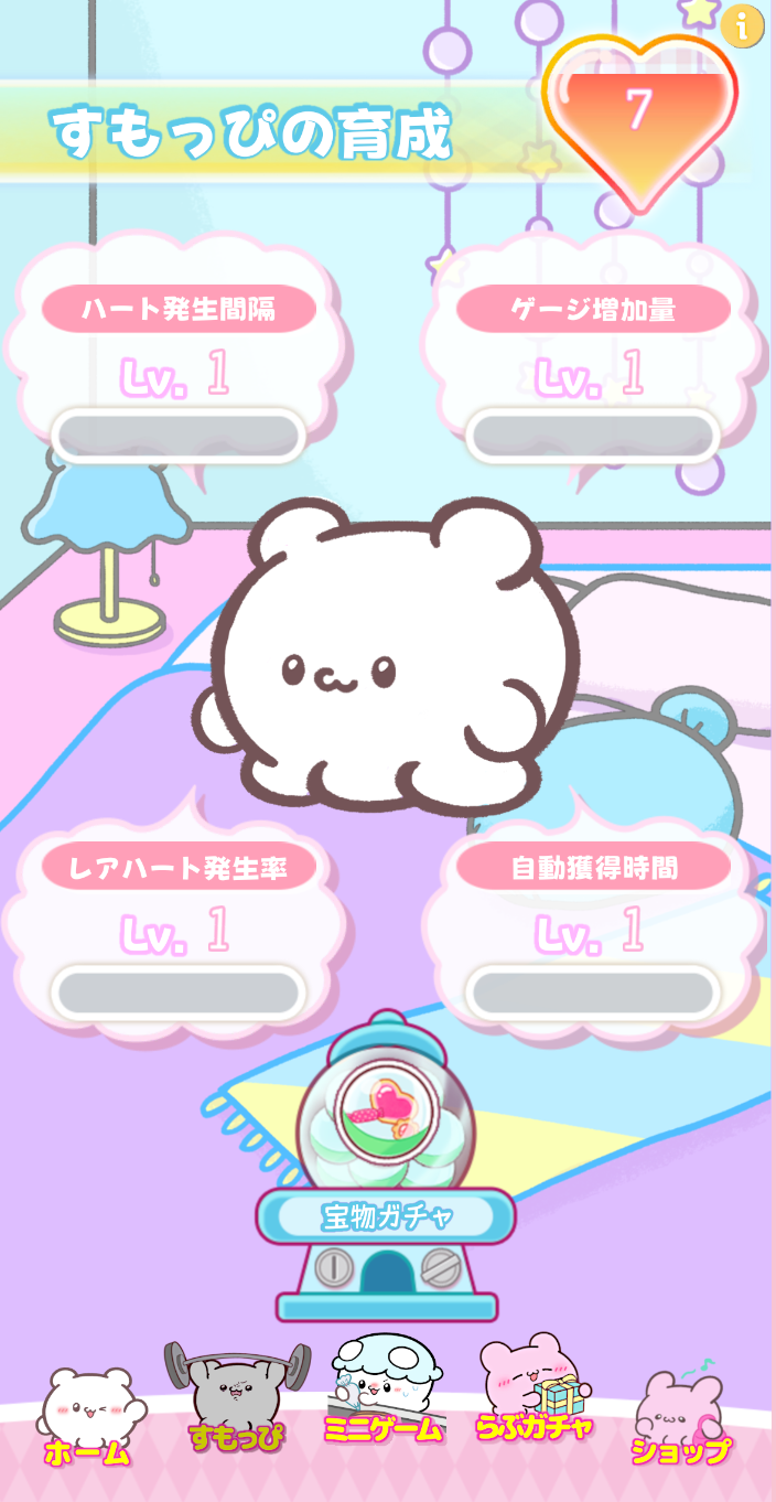 プレイヤーは時間経過で出現するハートをタップして集め、育成やプレゼントを通して「ぴょんちー」の好感度を上げていきます。