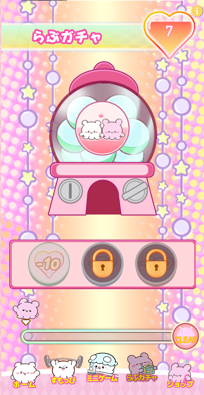 「らぶ」を使って「らぶガチャ」を回し、「ぴょんちー」にプレゼントを上げて好感度を上げていきます。